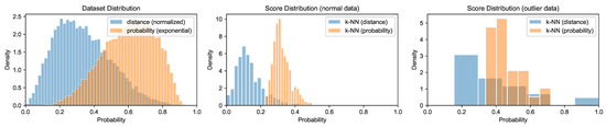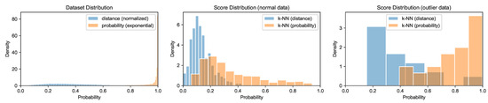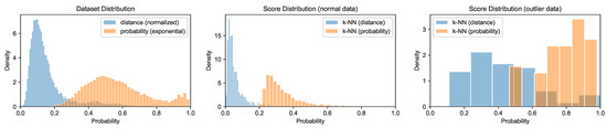 We propose a generic method to transform the scores of distance-based outlier detection methods into interpretable, probabilistic estimates. An outlier is often described as “an observation (or subset of observations) which appears to be inconsistent with the remainder of that set of data” [1]. The definition of an inconsistent observation depends on the application and algorithm used. Ruff et al. [2] define an inconsistent observation as “an observation that deviates considerably from some concept of normality”, but an inconsistent observation can also be defined as an object that stems from a different distribution from the model describing the data, as in the classical definition of Hawkins [3]: “An outlier is an observation which deviates so much from the other observations as to arouse suspicions that it was generated by a different mechanism”. An outlier is also referred to as an anomaly or novelty, sometimes interchangeably. Therefore, outlier detection is also referred to as anomaly detection or novelty detection. Because the methods used to detect outliers, anomalies, and novelties are mostly the same, we make no distinction between these terms and refer to inconsistent instances as outliers. Outlier detection is a broad research field that includes probabilistic approaches such as classical density estimation, clustering approaches to determine outliers, one-class classification methods, reconstruction-based methods, or generative approaches; for a detailed overview, refer to one of the extensive reviews [2,4,5,6,7,8]. In a distance-based setting, we can define outliers as objects located far away from the remaining objects.