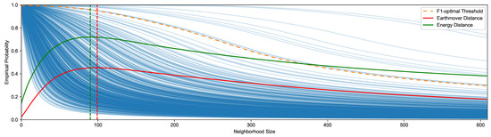 From an interpretability perspective, there are datasets where using the entire distance matrix as a normalization set results in useful probabilistic estimates, for example, the Crop dataset shown in Figure 5. However, using the entire distance matrix for normalization often leads to low probabilistic estimates for normal and outlier data points. The reason is that the resulting weighted neighbor distance is consistently low compared to all other distances in the dataset, even for outliers. In this case, a different normalization set has to be extracted from the distance matrix; for example, the m-neighborhood consisting of the distances to the m-closest reference points. It is possible to analyze multiple normalization sets for the outlier score predictions to provide more context for interpretation, a process we term probabilistic neighborhood analysis. For example, predictions can be interpreted using neighborhood probabilities from , resulting in different score distributions and different cut-off thresholds. The cut-off decision relies on the characteristics of the score distribution and is determined using statistical measures such as the median absolute deviation, domain knowledge or, when labels are available, performance metrics for binary classification [101,102]. To give an example for the TwoLeadECG dataset, in Figure 6 and Figure 7, we compare the initial probabilistic estimates using the entire distance matrix to a smaller, local normalization set identified using a probabilistic neighborhood analysis as shown in Figure 8. Using statistical measures of contrast, we derive a contrast-optimal neighborhood size of or depending on the statistical distance used, with a cut-off threshold of approximately 95%, as shown in Figure 8. The probabilistic neighborhood analysis clearly demonstrates the increased contrast using a smaller normalization set and additionally depicts the optimal cut-off threshold for different neighborhood sizes. Nonetheless, we note that an optimal cut-off threshold is difficult to determine in an unsupervised setting. To identify an optimal cut-off threshold, it is necessary to evaluate it against a performance metric such as the F1-score requiring normal and outlier labeled data, which are often unavailable. Using a probabilistic neighborhood analysis simplifies the identification of a suitable cut-off value, even when labels are unavailable. Thus, in addition to the improved interpretability, choosing an appropriate normalization set allows for a flexible definition of a cut-off threshold to transform outlier scores into class labels. Furthermore, it is possible to increase the contrast between normal and outlier data points using the right normalization set. Using statistical distances as a measure of contrast between normal and outlier scores, we can identify an optimal normalization set as shown in Figure 8.