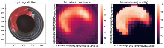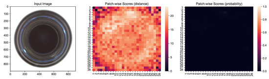 The PatchCore model is similar to , but uses a core-set sampled memory bank of patch-wise feature vectors that are generated using a pre-trained neural network. For PatchCore, the pixel-wise scores are determined through interpolation of the patch-wise scores; thus, it is not necessary to estimate a distance distribution per pixel, but one distribution per patch. Like the authors, we used the second and third layer of a WideResNet50 trained on ImageNet [103] to determine patches. Additionally, we used a single neighbor corresponding to the patch-wise approach with a core-set sampling ratio of 10%. To transform the pixel-wise scores into probabilistic estimates, we estimated patch-wise distributions and transformed the scores for each patch to probabilistic estimates accordingly. To determine an appropriate normalization set for each image-based dataset, we identified the optimal set in an m-neighborhood of with the largest contrast. We established the contrast between normal and outlier samples as the Earthmover distance between the image-level score distributions. We demonstrate that there are no significant ranking or detection differences between PatchCore and ProbabilisticPatchCore in Table 4 and provide a more detailed analysis of the results online (https://davnn.github.io/probabilistic-distance/, accessed on 1 June 2023). In Figure 9, we highlight the challenge of interpretability based on a normal data sample; without additional context, it is not clear how to interpret the resulting distance-based scores. In addition to the improved interpretability, we find that the probabilistic normalization greatly increases the contrast between normal and outlier data points in the image detection tasks, as visible in Figure 10.