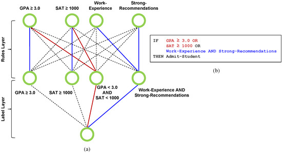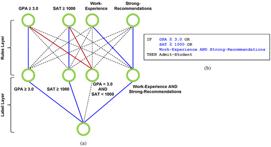 In the Rules Layer shown in Figure 1a, the blue lines indicate positive weights, the red lines indicate negative weights, and the dashed lines indicate zero weights, which means the corresponding inputs are excluded from the rule formed. For example, the first hidden layer neuron is interpreted as the rule “GPA ≥ 3.0”. For the third hidden layer neuron, the red lines indicate “NOT (GPA ≥ 3.0) AND NOT (SAT ≥ 1000)”, which is equivalently represented as the rule “GPA < 3.0 AND SAT < 1000”. The last neuron is interpreted as the rule “Work Experience AND Strong Recommendations”. Similarly, in the Label Layer, the blue lines again indicate positive weights, which means the corresponding rule is included in the rule set, and the dashed lines indicate zero weights, which means the corresponding rule is excluded from the rule set. Together with the hidden layer of the AND neurons, the overall DR-Net architecture implements a trainable AND-OR network as a Boolean formula in DNF that directly maps to an unordered set of IF-THEN rules, as shown, for example, on the right-hand side of Figure 1b.
