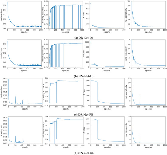 Lastly, we note that the number of rules decreased dramatically in the first few epochs of the training period for DR-Net-L0 and NN-Net-L0, as most of the rules were obviously redundant and pruned simultaneously. The behavior of a significant decrease in the number of rules can also be observed for the networks trained using reweighted regularization at around epoch 200, which explains the disturbances found in the rest of the plots in Figure 3c,d.
