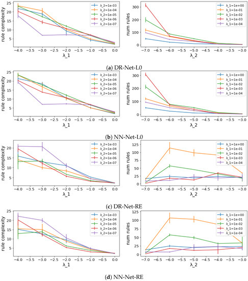 In the left column of Figure 4, each line in each plot shows the changes in the rule complexity as increases for a fixed value of . For all four methods, the rule complexities monotonically decrease as increases from to 1 (note that the values on the x-axes are all on log scales), showing the high effectiveness of the regularization term for the Rules Layer among all four methods. The good correlation between the rule complexity and for all methods provides our methods with a foundation for excellent accuracy–complexity trade-off capabilities. Similarly, the lines in the right column of Figure 4 indicate how the number of rules of the derived decision rule set is changed with respect to given that is fixed for each line. The number of rules also decreases monotonically as increases from to for the networks with regularization, while there is no clear relation between the number of rules and for networks trained with reweighted regularization. Thus, compared to networks with reweighted regularization, networks trained using regularization demonstrate better potential for reducing the number of rules, as a larger will consistently result in fewer rules. However, training networks with reweighted regularization should still be considered as a valid approach, since even the maximum value of the number of rules for DR-Net-RE and NN-Net-RE shown in Figure 4 has been pruned to be less than 125, which is a substantial reduction compared to the starting point of 1000 rules.