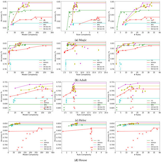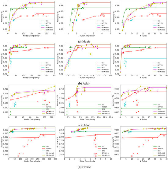 The defining attribute of both DR-Net and NN-Net, namely, the ability to reach high test accuracy while maintaining an acceptable level of model complexity, is further emphasized in Figure 5 and Figure 6. For both the heloc and house datasets, it becomes apparent that all variants of DR-Net and NN-Net outperform other rule learners across all three complexity metrics. This superiority is demonstrated by the fact that their Pareto efficient points consistently occupy the top positions. With regard to the magic and adult datasets, all variations of DR-Net and NN-Net continue to showcase superior performance over other rule learners in terms of accuracy, and this margin of superiority becomes substantially evident when the model complexity, rule complexity, or the number of rules surpasses a specific threshold. BRS, on the other hand, fails to present a clear accuracy–complexity trade-off, as its results are tightly clustered within a narrow range, an observation that has been noted and explained in [6,11]. This experiment affirms the potential advantages of DR-Net and NN-Net over other rule learners, primarily due to their capability of achieving a significantly higher test accuracy with a relatively moderate sacrifice in complexity.