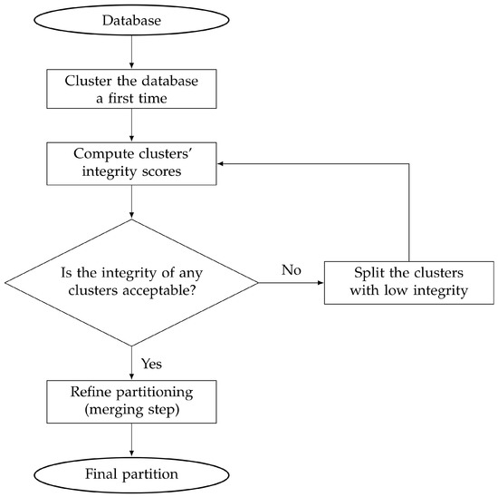The recursive decomposition principle is fairly intuitive, and has the advantage of greatly diminishing the impact of a wrong value set for the objective of clusters, if any. For instance, assuming the database actually features clear regions, and that one partitions it using the K-Means such that , thus some regions will be merged (best case), or even wrongly split (worst case). Nevertheless, assuming that merging two dissimilar regions with each other will lead to a unique cluster with a low integrity is not a so strong assumption; as a consequence, the problematic cluster would be detected and split to cluster it (more) correctly. However, this may lead to numerous small clusters, and the two regions considered may be split into many pieces, leading to inconsistent groups, likely poorly meaningful. That being said, all the data of a given region should have very similar features (especially compared to that of the other regions), thus, if that region is decomposed into several groups, they should all be very similar, and thus it should be fairly possible to compare them, and then to merge them to reform the original region.