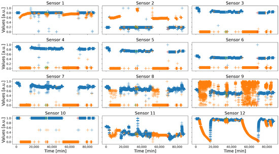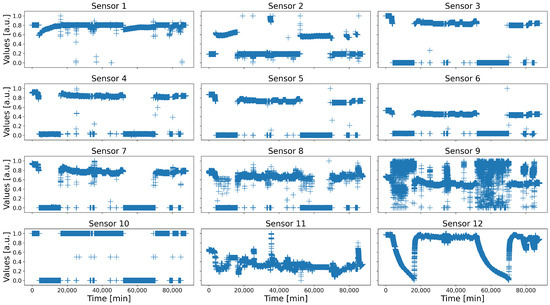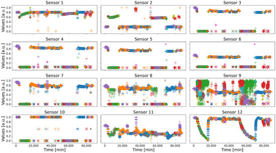 One of the industrialists involved in the project HyperCOG is Solvay, a chemistry plant located in La Rochelle, France, specialized in rare earth specialty products. In order to test and assess the solutions developed during the project, they provided the partners with several datasets recorded in real situations. One of them is a two-month long record of fourteen key sensors, operating at a frequency of one data every five minutes, for a total of 17,568 samples. Over that period, the processes worked correctly most of the time, although some local events occurred nonetheless (e.g., short maintenance or true anomalies). Notice that the data of two of these sensors were almost the same than that of two other sensors, which have therefore been removed to avoid redundancy. Additionally, the sensors have been normalized between 0 and 1, and their names and dimensions have been randomized for confidentiality concerns. The corresponding dataset is depicted in Figure 3.