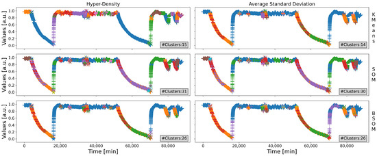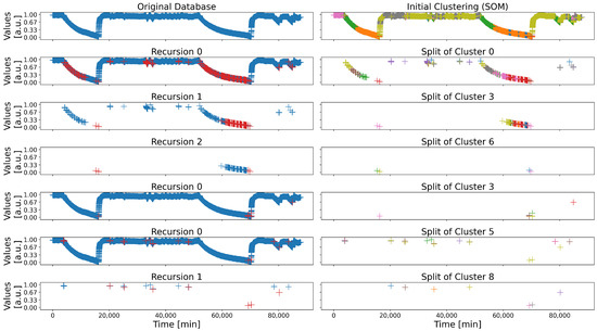 First, any unsupervised clustering algorithm may be used, but the BSOMs are good candidates, for they are accurate, and perform well with real industrial data, especially in the identification of the regular states of industrial systems [71]. The grid’s size still must be set, but the recursive decomposition approach diminishes the importance of that value; as such, a default map is more than enough to cover almost any cases. Notice that several clustering algorithms may also be used in the different stages of the decomposition (for instance, a BSOM for the initial partitioning, then a K-Means, with K set to 2 or 3 for the recursive decomposition of the clusters to limit the number of groups generated).