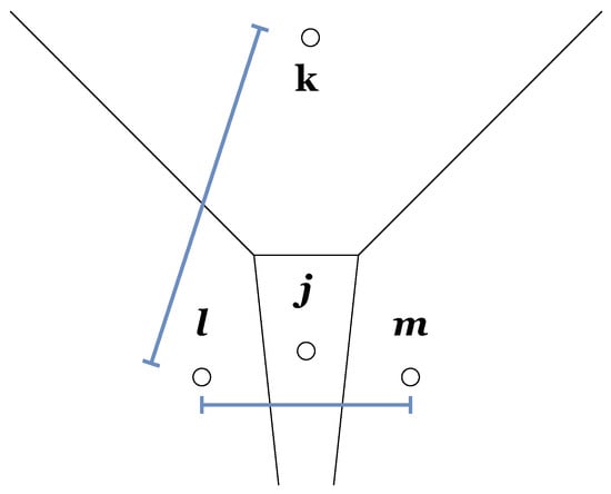 Four points l, k, and m and their Voronoi cells. The distance between l and k is larger than between l and m: . Between l and m lies the point j. The example illustrate the different types of neighborhoods: unidirectional versus direction-based.
