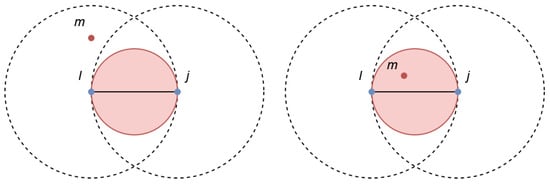 Empty ball condition of the Gabriel graph. (Left): m is an intruder. (Right): m is no intruder.