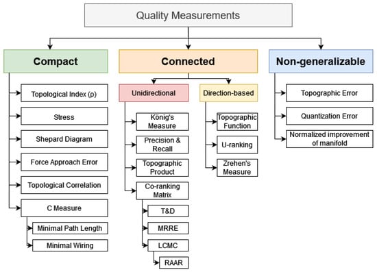 In general, three types of QMs and some special cases can be identified, as shown in Figure 4. The first type of QMs is called compact because measurement of this type compares the arrangement of all given points in the metric space as expressed in terms of distance. In the literature, the term topographic is often used for such QMs, e.g., [22]. These QMs depend on some kind of comparison between inter- and intra-cluster distances.