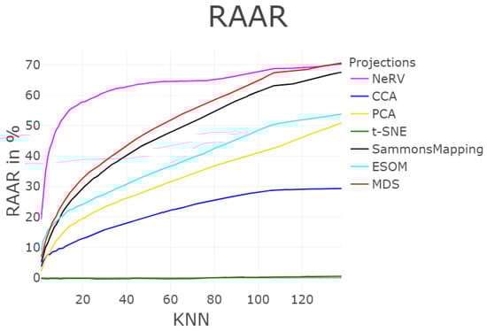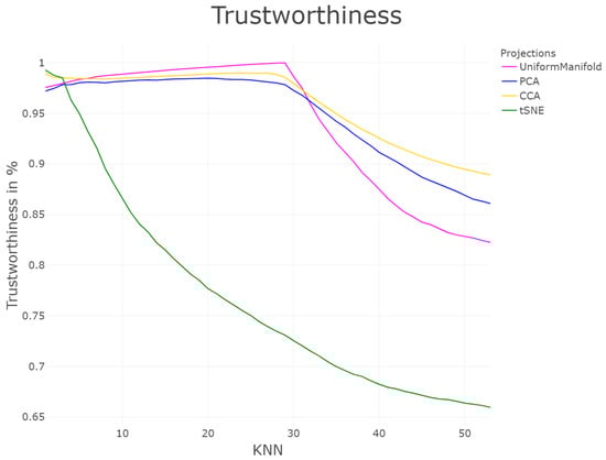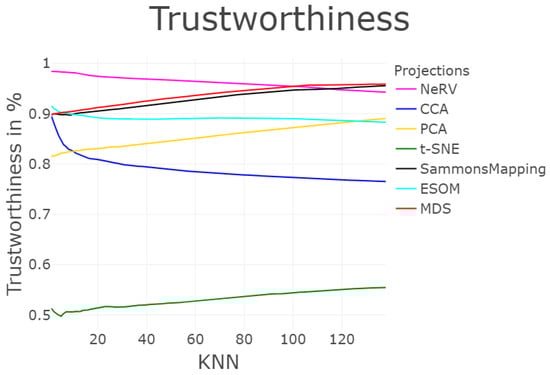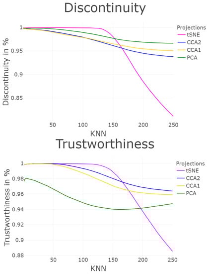 Venna and Kaski claim that the trustworthiness () quantifies from “how far from the original neighborhood [in the input space I the new points [] entering the [output-space] neighborhood [H(knn, O/I)] come” [32]. For the calculation of the T&D measurements, KNN graphs must be generated for various knn values. Then, the trend of the curve can be interpreted. It is unclear how many knn values must be considered. Hence, knn values up to 25% of the total number of points are plotted. Lee and Verleysen showed that the T&D measurements can be expressed as a special case of the co-ranking matrix [28].