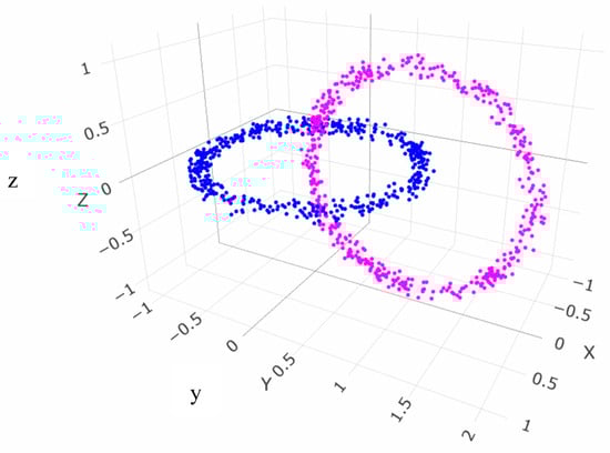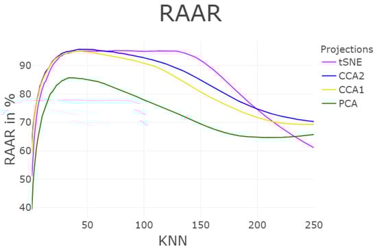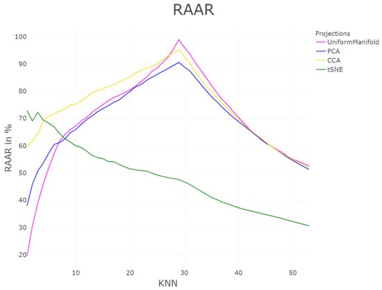 For the projection methods considered here we used freely available code which is summarized in the ProjectionBasedClustering CRAN package. For principal component analysis (PCA) [86], we used the PCA software available in the R package stats [87]; for curvilinear component analysis (CCA) [56], the CCA source code was ported from MATLAB to R and for t-distributed stochastic neighbor embedding (t-SNE), we used Donaldson’s t-SNE implementation. Also included in the evaluation of various projection methods were the Neighbor Retrieval Visualizer (NeRV) algorithm [8] as implemented in the freely available C++ code called in R., the Sammon Mapping technique for multidimensional scaling (MDS) [88] available from [87], and the emergent self-organizing map (ESOM) algorithm as implemented in the R package Umatrix available on CRAN (https://CRAN.R-project.org/package=Umatrix, accessed on 11 July 2023).