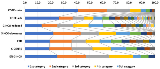 The comparison of category distributions in genre datasets in terms of percentages of instances belonging to each category, from the most frequent category (1st category) to the least frequent one.