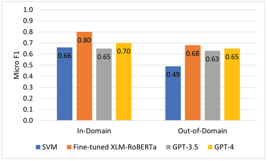 Among the available monolingual and multilingual autoencoder models, the multilingual XLM-RoBERTa model [55] has proven to be the most appropriate for the task of automatic genre identification. It has outperformed other multilingual models and achieved comparable or even superior results to monolingual models [32,33,54]. Nevertheless, despite the superior performance exhibited by fine-tuned BERT-like Transformer models, a considerable proportion of instances—up to a quarter—continue to be misclassified. The most recent in-dataset evaluations of fine-tuned BERT-like models on the CORE [17] and GINCO [19] datasets yielded micro-F1 scores ranging from 0.68 to 0.76 [19,33,53]. This demonstrates that this text categorization task is much more complex than tasks that mainly depend on lexical features such as topic detection, where the state-of-the-art BERT-like models achieve an accuracy of up to 0.99 [48].