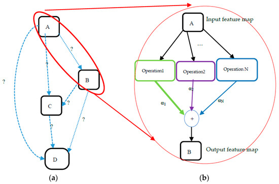 After the relaxation of the search space, the next step is bi-level optimization that aims to jointly learn both the architecture parameters (α) and the weights (ω) within all the operations in the network. The training loss () and validation loss () are affected by both the network structure and the weight of the network (). The goal of the architecture search is to find α∗ that minimizes the validation loss (∗,α∗), where the weights ∗ associated with the architecture are obtained by minimizing the training loss ∗ = argmin The problem can be expressed as follows in a bi-level optimization form (Equations (3) and (4) below):