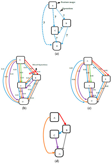 DARTS overview. (a) The operations on the edges are first unidentified. (b) Continuous relaxation of the search space through the placement of a mixture of candidate operations on each edge. (c) Solving a bi-level optimization problem to jointly improve the mixing probabilities and network weights. (d) Using the learned mixing probabilities to infer the final architecture.