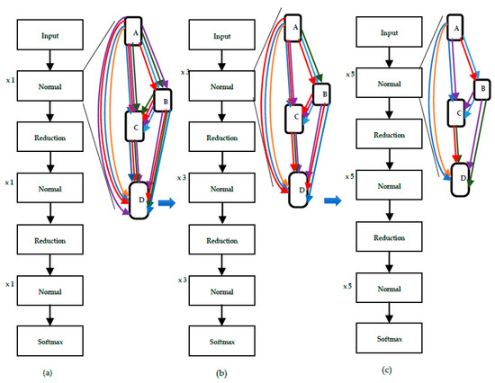 This figure is adapted from [11] with a few modifications. The overall pipeline of PDARTS. (a) Depicts the initial stage with a shallow architecture and each cell containing all operations. (b) Represents the intermediate stage with a deeper architecture and each cell containing a reduced set of operations. (c) Illustrates the final stage with an even deeper architecture and each cell incorporating the fewest operations. (here, ×1 implies 1 cell, ×3 implies 3 cells and ×5 implies 5 cells).