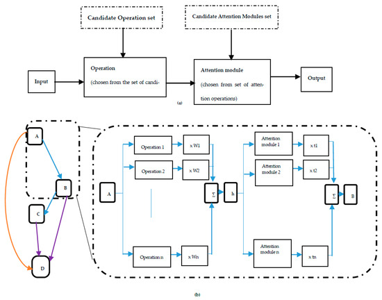 This figure is adapted from [13] with a few modifications. (a) Overview of Att-Darts. Both the operation and attention module are chosen from the candidate space. (b) Illustration of how operation, as well as attention module, is inserted between the nodes.