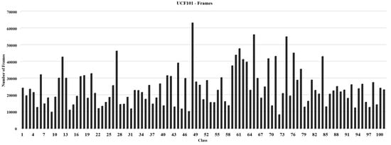 Action recognition in computer vision consists of several steps, such as video preprocessing, image classification, and a postprocessing step, including temporal modeling in real-time and offline applications. The UCF101 is a well-known, broadly used, and highly referenced action recognition dataset collected by the Center for Research in Computer Vision at the University of Central Florida []. The dataset includes 101 different human actions, as shown in Figure A1, collected from YouTube videos that are publicly available. The dataset can be categorized into five major classes: (a) sports, (b) playing musical instruments, (c) human–object interaction, (d) human interaction, and (e) body motion [] (Soomro et al., 2012). UCF101 is the first action recognition dataset with the highest number of classes and ranks among the top computer vision datasets that are publicly available, focusing on action recognition and event detection. The reliability of the dataset is validated since this dataset is widely used and cited by prestigious manuscripts at top-tier computer vision conferences and in journals [,]. Furthermore, the dataset is trustworthy, as the raw data are videos collected through YouTube, publicly available and carefully annotated by the dataset owner, and verified by researchers over the years [,]. The UCF101 provides the training and testing splits of videos; this allows researchers to consistently compare their results, which is considered an additional source of validity and trustworthiness of the dataset.