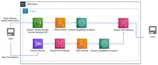 A stable cloud architecture used for offline and real-time applications with a batch-processing approach was considered, as illustrated in Figure 3. This architecture was carefully designed by consulting two reference architectures published by AWS Machine Learning Blog (publicly available), which are (a) Machine Learning Inference at Scale Using AWS Serverless (https://aws.amazon.com/blogs/machine-learning/machine-learning-inference-at-scale-using-aws-serverless/, accessed on 30 August 2023) and (b) Building a Data Pipeline for Tracking Sporting Events Using AWS Services (https://aws.amazon.com/blogs/architecture/building-a-data-pipeline-for-tracking-sporting-events-using-aws-services/, accessed on 30 August 2023). We used various AWS instances to explore the training duration and inference latency to discover the most optimal instance for deployment purposes.