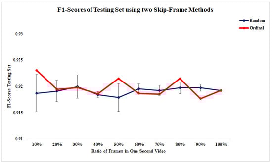 We aimed to further optimize the inference latency of the optimal vision transformer topology using an enhanced in-house version of the skip-frame approach []. We leveraged the skip-frame approach and developed a two-stage algorithm to find an optimal ratio of frames within one second concerning the number of frames in the given second (FPS) across our testing set. In the first step, we randomly shuffled the frames’ indices in each second of videos; then, we started from 10% to 100% of frames with a step of 10%. We repeated this process five times and measured the average and standard deviation of F1 scores against the testing test. In the second step, we selected the video frames in each second using an ordinal approach instead of randomly shuffling samples. For example, 50% of frames in this approach were selected by skipping one frame at a time. Next, we measured the F1 scores against the testing set. Lastly, we introduced an error metric to measure the distance of corresponding experiments in the first and second steps. The objective was to find a ratio with a minimum error using Equation (1). A ratio with a minimum error rate could represent a stable threshold for maintaining the performance while reducing the number of frames, resulting in lower inference latency in our real-time batch processing approach.