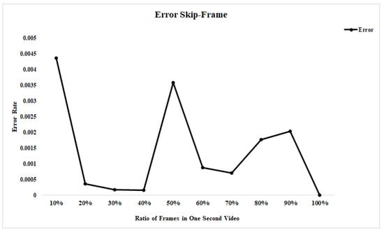 The error rates defined in Equation (1) across the analysis of ten ratios show that both skip-frame methods converge at a 40% frame ratio, with the lowest error rate and standard deviation in the random method. This enhanced approach should be considered a hyperparameter in each relevant study as it can reduce the number of frames to predict at inference.