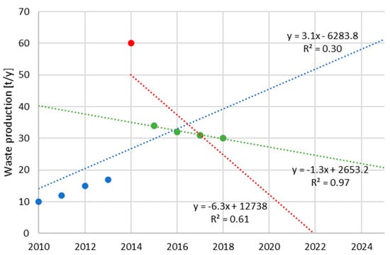 An example of anomalies in data is shown in Figure 1; it is chosen to resemble waste generation datasets. Obviously, the data in Figure 1 show signs of anomalies. When an outlier is identified, this point is removed for further work with data. In the case of step changepoint and trend changepoint in the data, respectively (see Section 1.2), only a part of the time series after this anomaly is considered further. When comparing the common linear trend, significant differences in future forecasts can be seen in Figure 1 (blue: 2010–2018, red: 2014–2018, and green: 2015–2018) according to the identified anomalies. Identifying outliers in the first step is crucial but not always straightforward. Subjectively, it can be determined that there is an outlier value in 2014 and that the production trend has changed since 2015 (green). It can be assumed that the trend change is a part of cyclicality, and a decline may be followed by an increase in the future. In the case of cyclicality, the data would oscillate around the trend shown by the blue line. However, cyclicality cannot be clearly demonstrated in such a short time series. If the value in 2014 was not evaluated as an outlier, the changepoint between 2013 and 2014 can be identified (red). The authors are convinced that the most probable upcoming trend is the green line (data 2015–2018). This hypothesis of the authors was subsequently tested in Section 3 after the introduction of new methods of identification of anomalies in data. However, this opinion may not prove to be correct in the future, and it is necessary to revise it with new data. This is a major contribution of this contribution.