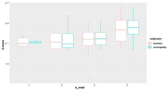 The threshold was set as the sample for the z-score, as shown in Figure 3. First, the median of the expert evaluation was calculated for each evaluated series. Due to the odd number of experts, categories 1–4 were maintained. Subsequently, the median rating was compared with the criterion value of the suspected point. A graphic representation is provided in Figure 3. The resulting limit value of 2.17 was determined as the median of the z-score for the median expert evaluation (e_med = 3). It is also easy to see from Figure 3 that the differences in medians between originators are typically not very large; therefore, it is possible to use a universal parameter for both originators.