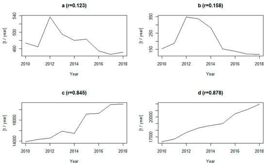 Data transformations can even improve the properties of the time series under examination. On the other hand, commonly used transformations like logarithms can bring in some problems if zero waste generation is possible for a particular waste type. In such a case, zeroes need to be replaced, but the selection of the right value for replacement can be a difficult task with a big impact on subsequent analysis. Thus, none of these adjustments was used here. This problem remains an option for future research.