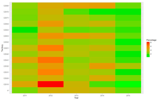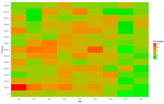 Blázquez-García et al. [21] deals with both univariate and multivariate case. The mentioned univariate and multivariate methods are basically in agreement with already mentioned reviews [19,20]. However, the usage of univariate methods for multivariate cases is also discussed. The main direction in how to leverage well-developed univariate methods is to first apply a dimensionality reduction technique (e.g., PCA—principal component analysis) and then one of the traditional methods. This method is able to compare the municipalities in individual years and identify outliers. It is, therefore, not a question of evaluating outliers in a time series but rather of identifying localities with anomalous behavior. This approach is not suitable for the application required in this study, where outlier removal is to precede changepoint detection.