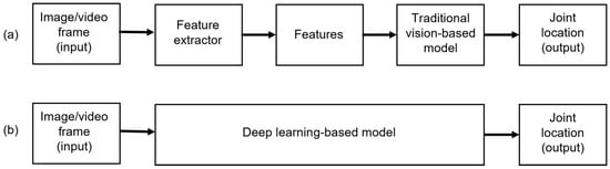 In contrast, deep learning-based methods have made significant progress in HPE due to their ability to extract features from data implicitly [,]. In other words, there is no need to extract specific features as in traditional methods. Additionally, the availability of large, annotated datasets, developments in computational hardware, and, most notably, the use of deep convolutional networks (ConvNets) in current HPE algorithms have led to a significant boost in performance []. Deep learning-based methods can handle most HPE challenges, unlike vision-based methods, such as estimating nonvisible key points. The first study to convert the HPE process from traditional to deep learning-based was the DeepPose model []. This model uses several ConvNets layers to regress the body joint location from a single image.