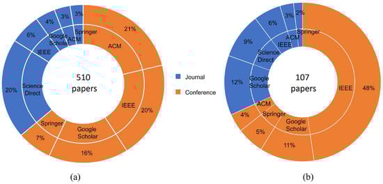 Distribution of publications of journals and conferences, where (a) is the distribution of the initial search result, and (b) is the distribution of the papers after applying the filtering process.