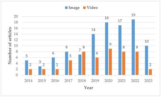 The distribution shows 159 articles that pass the exclusion filter. These articles were distributed according to the type of input data: image and video.