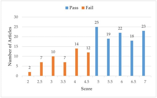 This section covers the quality assessment outcome to choose relevant articles. Based on quality criteria, we defined them in Section 2.3. Failure to provide information according to quality assessment criteria results in a lower paper evaluation score. Papers that scored 4.5 or less out of 7 are eliminated from the candidate set. Therefore, only papers of high quality are considered. Figure 6 shows the papers that failed and passed these criteria. Only 107 out of 159 articles passed the quality assessment criteria and Figure 7 shows the distribution of these articles that are included in this review.
