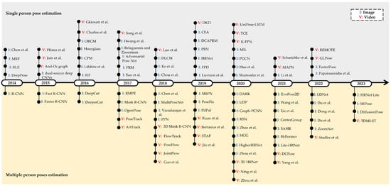 The above surveys focus on images as input data, while only a few are interested in video processing [,,]. To our knowledge, only two surveys [,] have covered multipose video-based estimation. Their classification of methodologies differs, and ref. [] summarized fewer than ten works. Therefore, in addition to covering pose estimation using a single image, we will also cover single and multipose video-based methodologies in depth. Furthermore, since many surveys do not cover essential sections such as pretrained feature extraction models and loss functions, we will include them here.