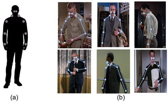 The JHMDB dataset contains complete annotations of human actions [], such as brushing hair, catching, clapping, and climbing stairs. It is used for human action recognition and human pose estimation. Each person in this subset has 15 annotated joints and around 900 video clips. This dataset annotates human actions in each frame, including scale, segmentation, pose, and optical flow. Figure 11 shows samples of the dataset and keypoint annotations.