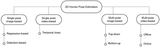 Recently, the number of published surveys concerned about HPE has increased [,,,,,]. Like other surveys, the taxonomies for HPE in these surveys are the same. Methodologies are classified based on the number of people in the input data [,,]. Each classification has a subcategory: regression and heatmap for single-pose estimation and top-down and bottom-up for multipose estimation. Most works that have made significant progress in HPE are included under each subcategory. However, the surveys by Toshpulatov et al. [] and Liu et al. [] grouped these works based on similar tasks performed by deep learning models. These tasks include structural modeling, refinement, multistage processing, and multitasking.