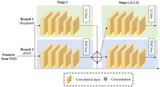 Recently, most deep learning-based methods [,,] use pretrained models that implicitly extract human body features while focusing on designing network structures that predict keypoint coordinates. Different techniques (e.g., multistages and branches) and different feature levels (global and local) are used in building the model. As a result, the accuracy of the model has increased. However, the model’s size also increases, leading to an increase in computational complexity. Therefore, some methods attempt to build a network structure that balances the model’s accuracy and size. More detailed information about deep learning-based methods is covered in this review.