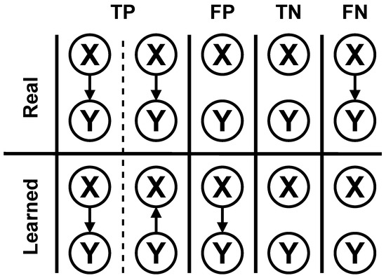 Examples of true positives (TPs), false positives (FPs), true negatives (TNs), and false negatives (FNs) for BN structural learning used for calculating F1 score, SHD, and BSF for the comparison of the performance of the search algorithms.