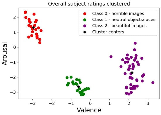 To obtain individual affect ratings, the participants scored all images on continuous valence and arousal scales prior to the VR experiment. The mean participant scores were clustered with the density-based spatial clustering of applications with noise (DBScan) algorithm and the cluster means were calculated; see Figure 2. This clustering resulted in 3 affect classes that will be used subsequently. To individualize the labels for each participant’s score, the distance from every single participant score to all cluster means was calculated and the image rating was assigned to the class label with the smallest distance. Following that, we obtained 3 affect classes used as affect-classification labels for each light condition, respectively.