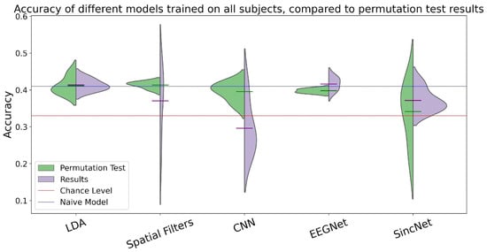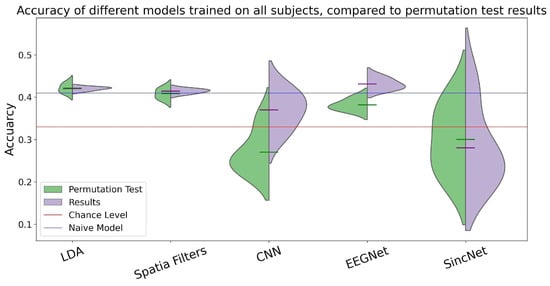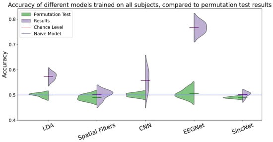Within the cold-light condition, no model performed significantly better than the permutation test model, although the LDA model, EEGNet, and SincNet performed on the mean above the permutation test model (see Figure 6). LDA model results and Spatial Filter model results performed on the mean above the naive model, while only the CNN model performed on the mean below the chance level. The Spatial Filter Model, CNN, and the SincNet permutation test distributions are very broad compared with the rest of the results.
