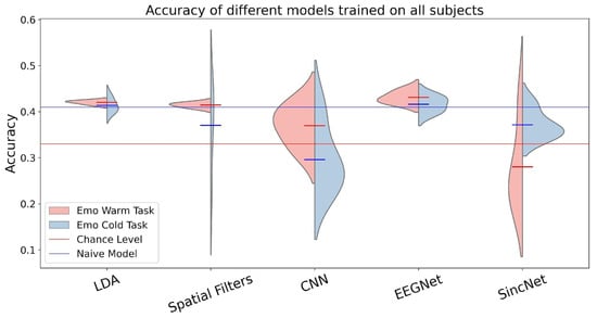 Figure 8 illustrates accuracy distributions for warm-light affect classification versus cold-light affect classification. No model showed significant differences in affect classification tasks, while classification in warm light resulted in higher mean accuracy levels than classification in cold light in four out of five models. The distribution that yields a higher mean accuracy is narrower than the respective distribution for the opposite task for all models. Only accuracy distributions of the LDA model and the EEGNet performed on the mean above the naive model level for both affect-classification tasks.