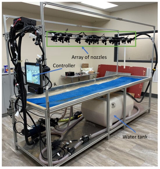 The experimental data utilized in this study were collected through a dedicated setup featuring crop spraying nozzles, as illustrated in Figure 1. The data collection process was conducted via a user interface controller, which regulated the flow rate of the water pumped from the water storage tank to the nozzles. The setup comprises an array of nozzles capable of producing different spray patterns. To record droplet motion, an Olympus i-SPEED 3 camera (Tokyo, Japan) with a frame rate of 2000 fps and a lighting system were positioned beneath the nozzles. However, annotating the data posed a tremendous challenge because there were thousands of droplets to be labeled in order to construct a sufficiently large ground truth dataset for training. To address this challenge, this work proposes a method for automatic annotation, which results in an accurately labeled and substantial dataset.