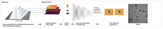 - Detection Head: The unified feature map was passed to the detection head, which is composed of convolutional and fully connected layers. It predicts bounding boxes, objectness scores, and class probabilities for droplets, which are respectively classified into large, medium, and small sizes. Anchor boxes were also utilized here, which helped in identifying droplets with diverse dimensions.