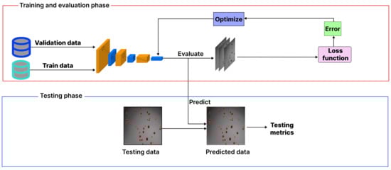 In this work, the training process for the deep learning model was formulated as an optimization problem, as described in Figure 5, where the objective is to find an optimal set of model parameters that minimize a loss function. The loss function quantifies the difference between the predicted and actual labels for the training data. In the case of our droplet detection system, we designed the loss function as a combination of the following: