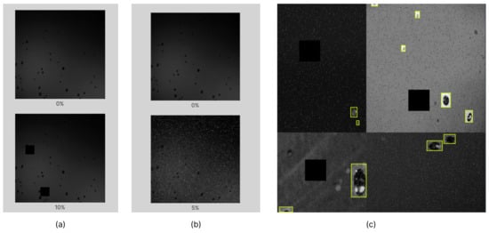 It is also evident from Table 2 that our model, when trained with the Previous dataset without any augmentation, demonstrated the least robustness to occlusion. In contrast, the model trained with the Augmented dataset, when using Mosaic augmentation, exhibited an improved performance, which was evidenced in it maintaining high mAP50 values even with partial droplet occlusions. The model trained with the New dataset, which included Mosaic augmentation and automatic labeling, showcased the highest resilience to occlusion with only a marginal decrease in the mAP50-95 when faced with up to 50% occlusion. The consistent precision and recall across varying levels of occlusion underscore the model’s ability to detect and correctly classify partially visible droplets, which is a critical aspect for real-world applications where occlusions are commonplace. In addition, in Figure 11b, we present a series of image patches that showcase the droplet detection model’s capacity to recognize droplets under varying conditions, including instances of partial occlusion. This robust detection even amidst occlusions can be attributed to the model’s learned feature representations, which are capable of capturing the essential characteristics of droplets even when they are not fully visible. The ability to discern partially obscured droplets is crucial for applications in dynamic environments, where complete visibility of every droplet cannot always be guaranteed. The results depicted in Figure 11b affirm the model’s proficiency in maintaining high detection accuracy—a testament to its robustness against occlusion.
