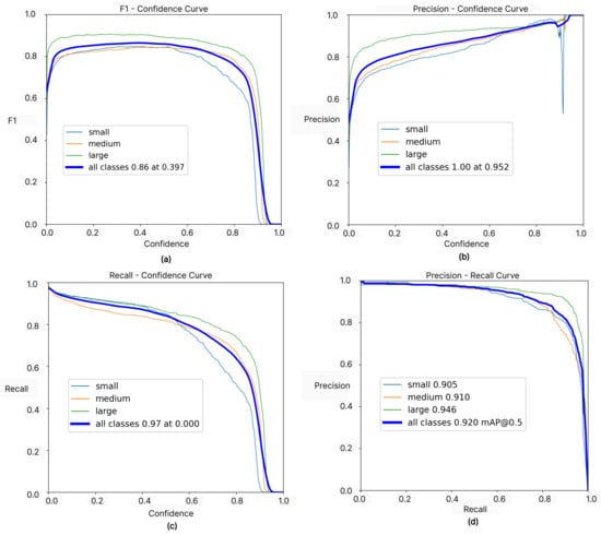 Figure 9 provides a visualization of the training performance of our model when trained with the New dataset, which also achieved the best performance, as shown in Table 1. Figure 9a illustrates the F1-confidence curve of our detection model across the different droplet sizes, namely small, medium, and large. The F1 score is a crucial metric in the field of machine learning and computer vision, particularly in tasks such as object detection, where the balance between precision and recall is vital. It provides a single metric that encapsulates the performance of the model in terms of both precision and recall. We can see that the high F1 scores ranging from 0.6 to 0.9 with a confidence threshold from 0 to 0.8 for all classes—including small, medium, and large droplets—are indicative of the model’s strong performance. The model’s performance was consistent across different droplet sizes, as evidenced by the close proximity of the F1 scores for the small, medium, and large droplets. This consistency was maintained over a wide range of confidence thresholds, thus indicating the model’s robustness in handling droplets of various sizes. The F1 scores exhibited a fast increase with a confidence threshold of 0 to 0.1, after which they stabilized up to a confidence threshold of 0.8. This suggests that the model’s performance remains steady over a wide range of confidence levels, thus reinforcing its reliability. However, a drastic decrease in the F1 scores was observed at a confidence threshold above 0.8. This is a common phenomenon in object detection models, as a confidence threshold close to 1 implies absolute certainty in the predictions, which is rarely achievable in practice due to inherent uncertainties and potential errors in the data or model.