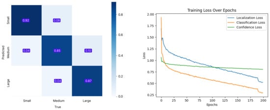 In addition to the mAP metrics, we also evaluated the training loss of our droplet detector, as indicated by the lost functions defined in Equations (7)–(10). The training loss provided insights into how well the model is learning from the training data and is an essential aspect of understanding the model’s convergence and overall performance. Figure 10 illustrates the results of training the droplet detection model over 200 epochs. It includes three types of loss: localization loss, classification loss, and confidence loss. The localization loss started at 1.68 and gradually decreased to 0.52 by the end of the training. This indicated that the model’s ability to accurately locate droplets within an image improved over time. The consistent decrease in the localization loss suggested that the model was learning the spatial characteristics of the target droplets effectively. The classification loss began at 1.93 and ended at 0.29. This metric measures the model’s ability to correctly classify the droplets within the image. The substantial reduction in classification loss over the epochs indicated that the model was becoming increasingly proficient at identifying the correct classes for the droplets. Simultaneously, starting at 1.06, the confidence loss dropped down to 0.8 after 200 epochs. Confidence loss typically measures the model’s certainty in its predictions. The decrease in this loss shows that the model’s confidence in its predictions improved but at a slower rate when compared to the other two losses. This is because the features that describe large, medium, and small droplets are very similar to each other, especially if the size differences are subtle.