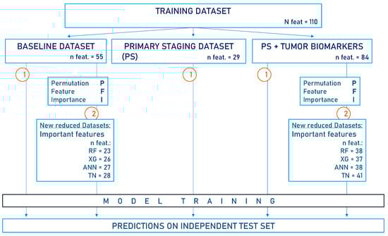 - We performed feature selection via PFI based on the BL dataset or the PS dataset with biomarkers. The important variables identified were used to create reduced datasets for model retraining (BL: n features = 23/26/27/28; PS + biomarkers: n features = 38/37/38/41 for RF/XG/ANN/TN, respectively).
