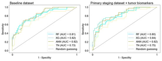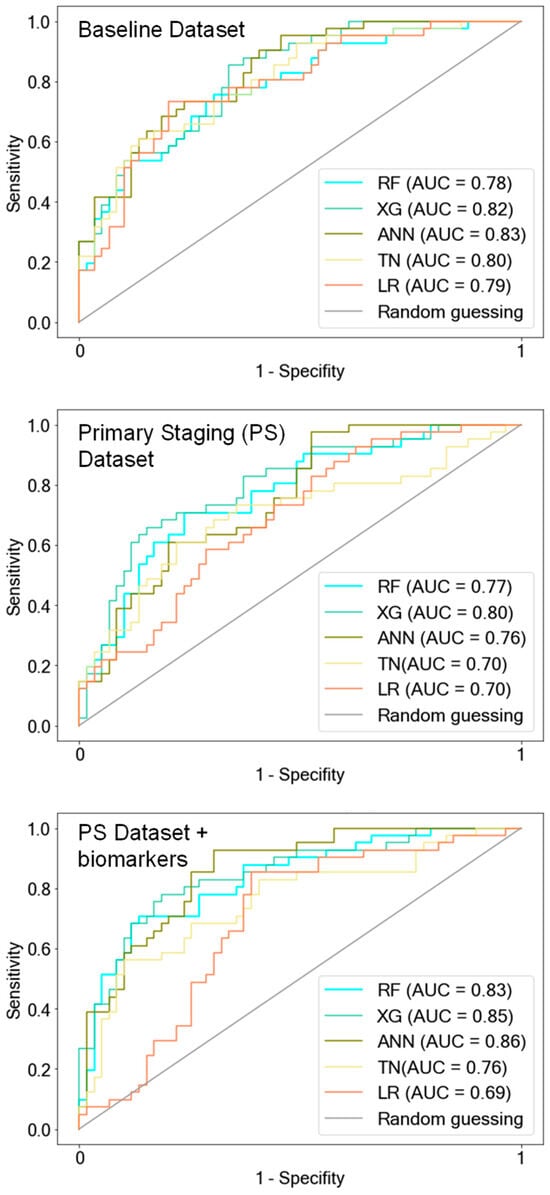 Surprisingly, when the tumor biomarkers were integrated into the PS dataset for model training, predictions improved. Accuracies demonstrated improvements, rising from 0.7 to 0.77 for RF, from 0.73 to 0.79 for XG, from 0.71 to 0.75 for ANN, and from 0.69 to 0.72 for TN (see Table 2: PS dataset vs. PS dataset + biomarkers).