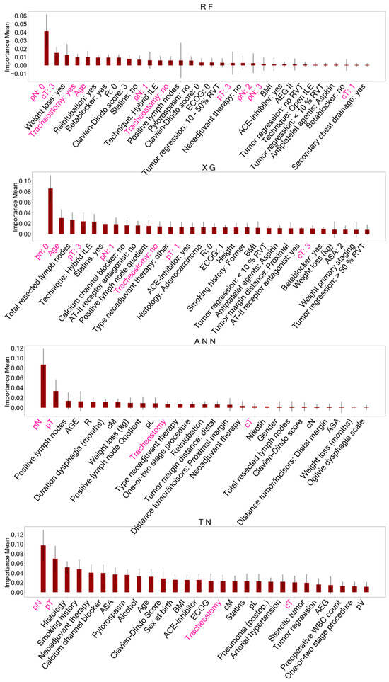 Important features identified with permutation feature importance (PFI) after training AI models on the baseline dataset. These features identified for each model accounted for reduced datasets to classify overall survival. Features of ensemble models (RF, XG) are presented as dummy variables. Shared important features between all models are marked in pink. A detailed description of the other features displayed can be found in Supplementary Table S1. RF = Random Forest, XG = Extreme Gradient Boosting, ANN = Artificial Neural Network, TN = TabNet, pN = histopathological lymph node status, pT = histopathological tumor size, cT = clinical tumor size.
